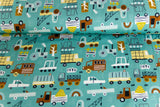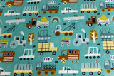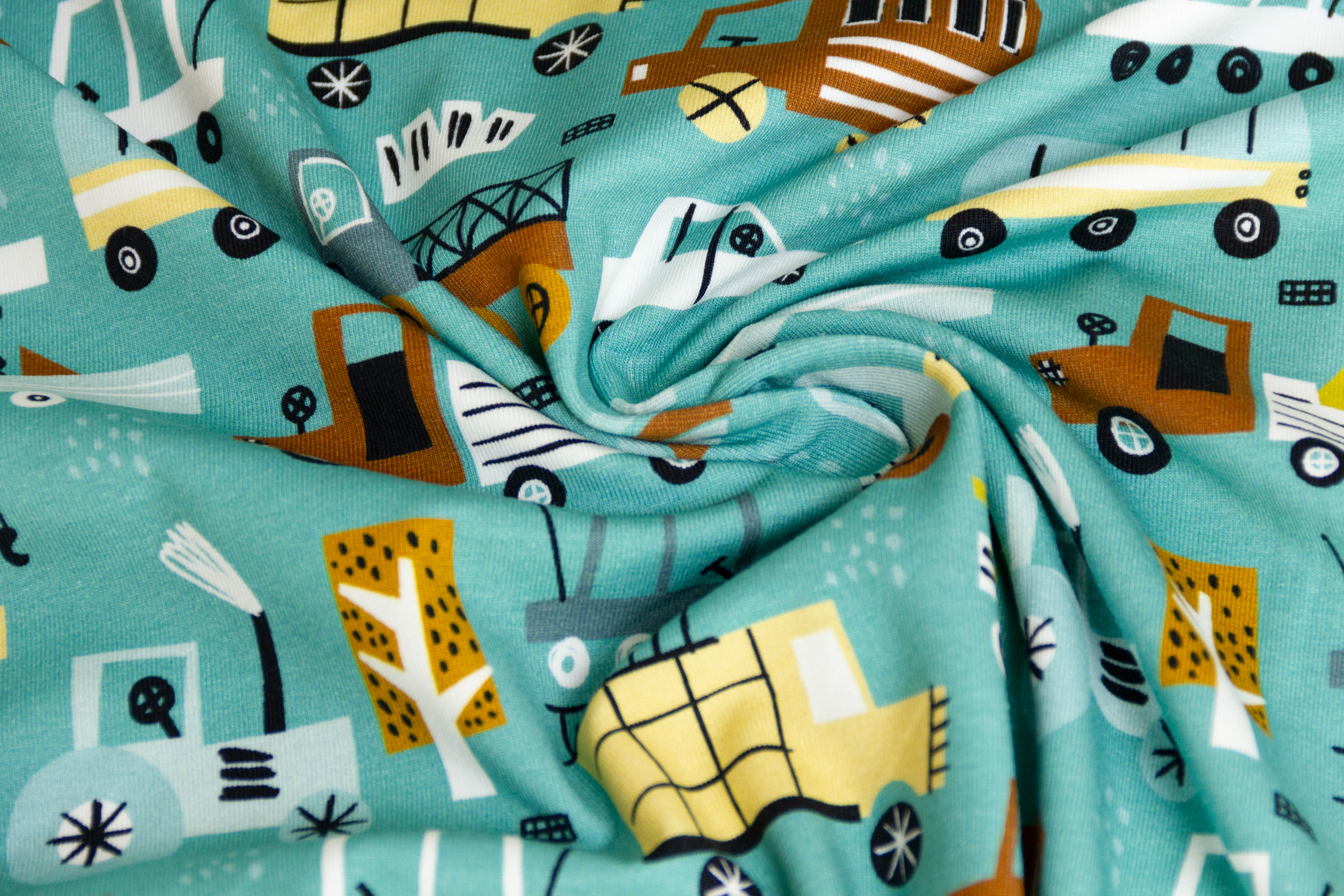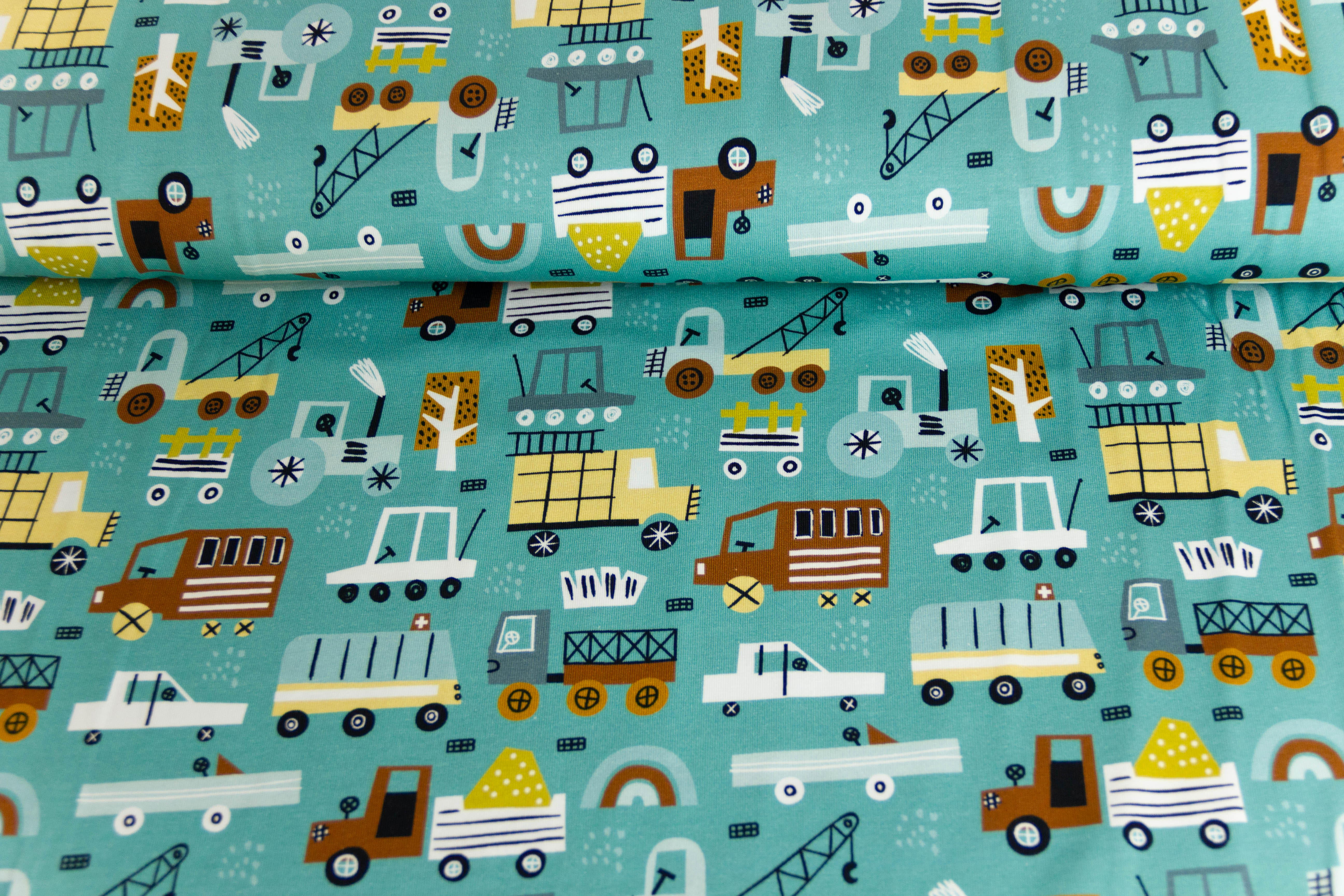 Süßes Nähpaket aus Baumwolljersey mit Fahrzeugen wie Traktoren, Lastern Einsatzfahrzeugen nach dem Design von Fräulein von Julie in türkis.