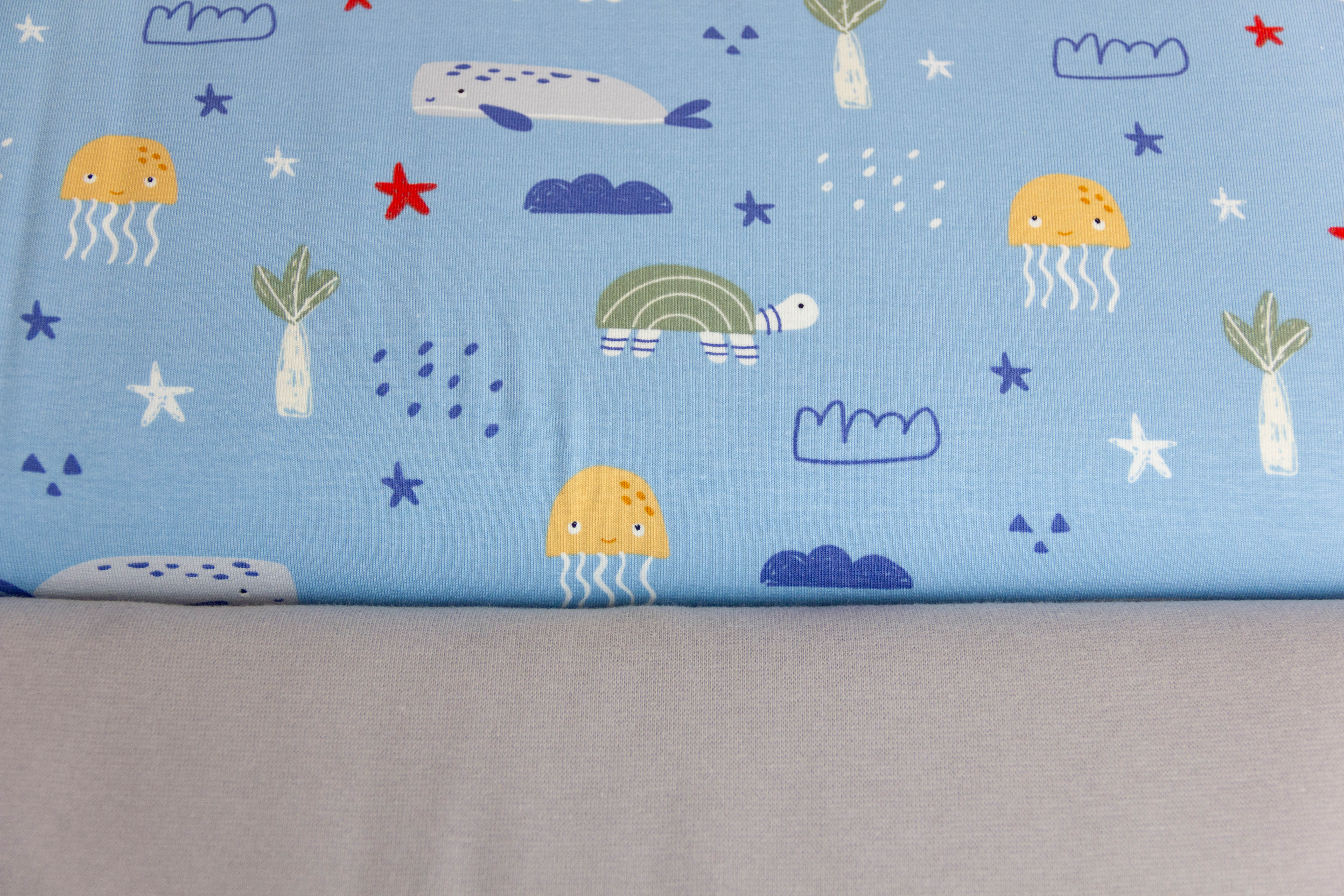 Tolles Nähpaket aus Jersey mit Meerestieren auf hellblauem Hintergrund.