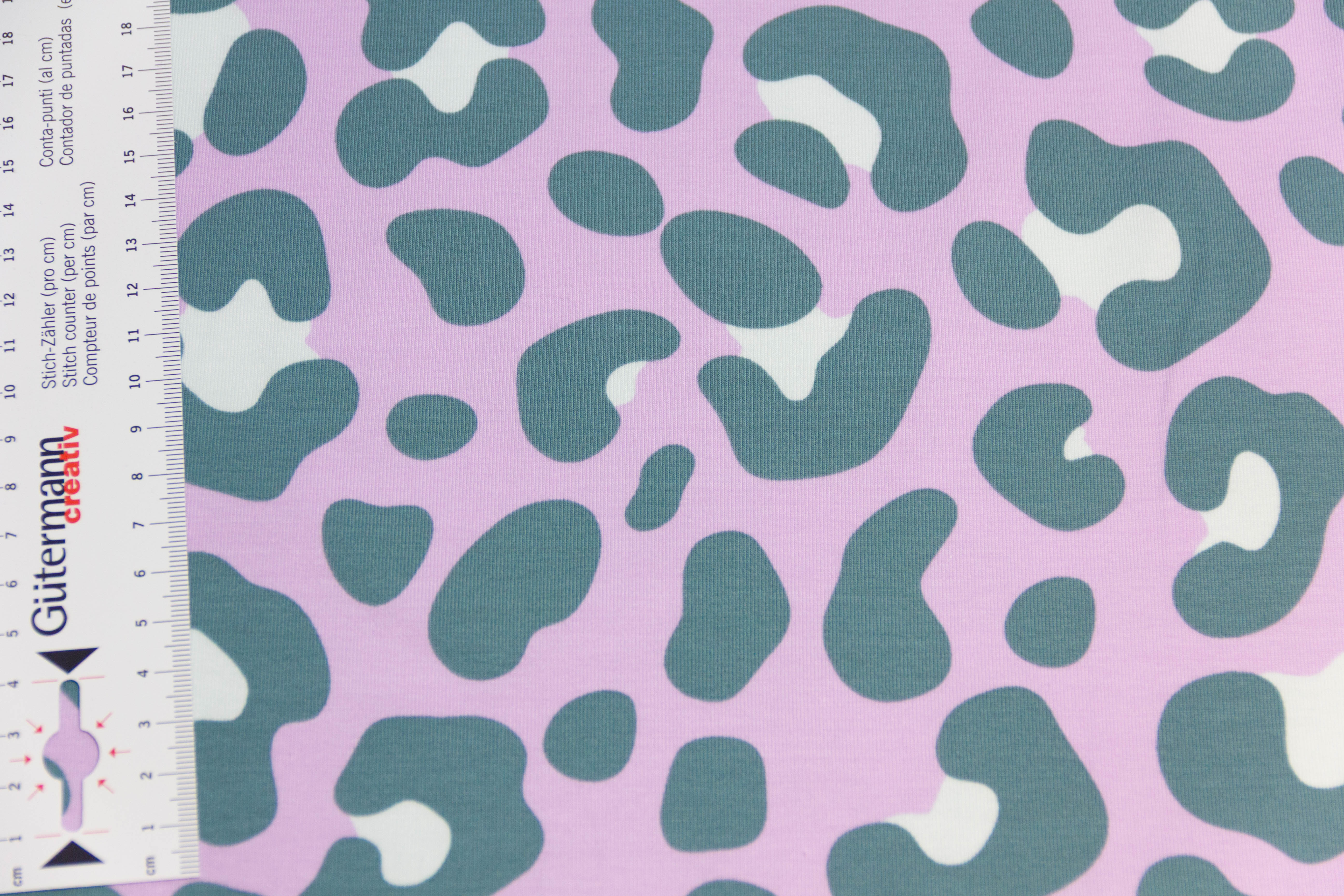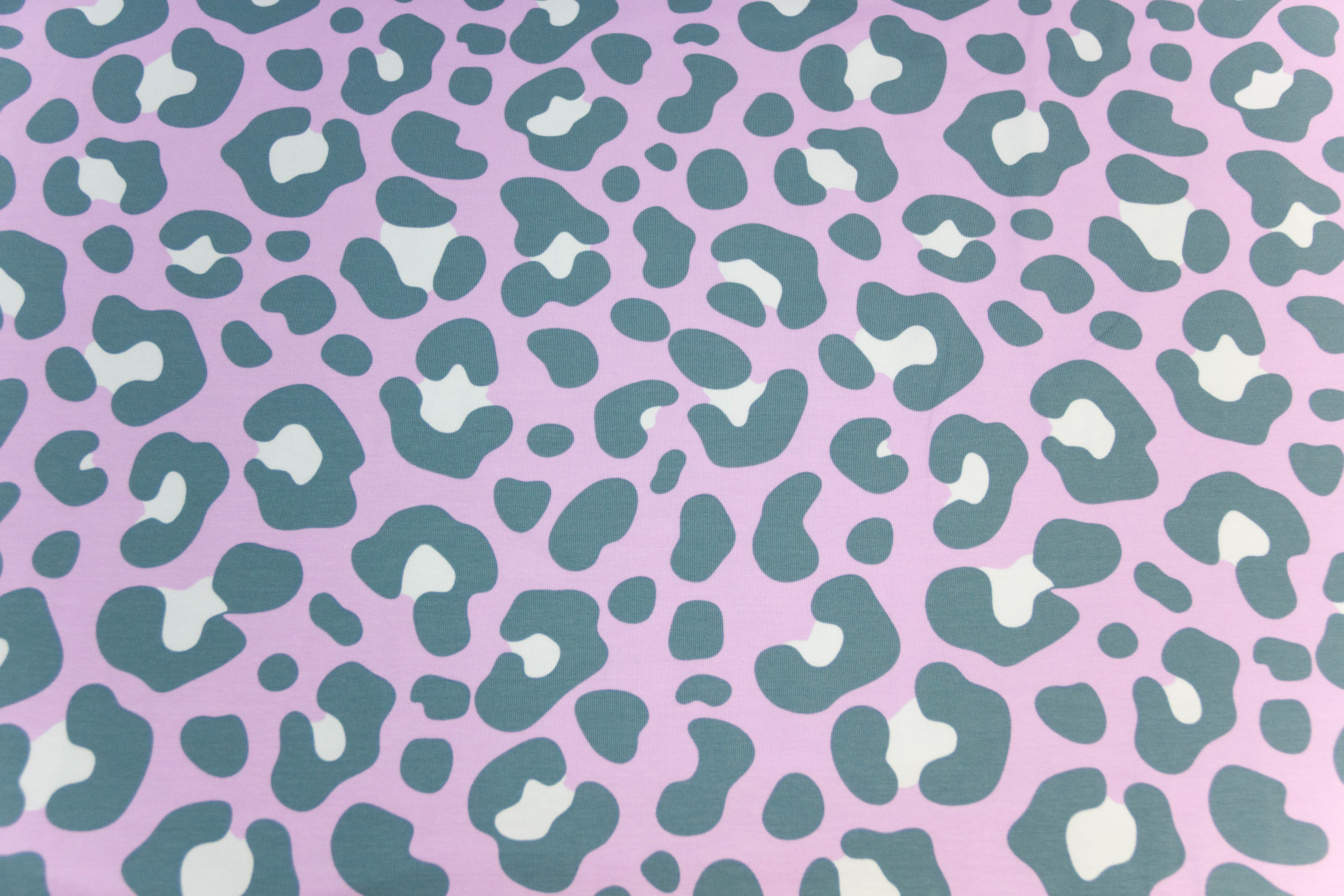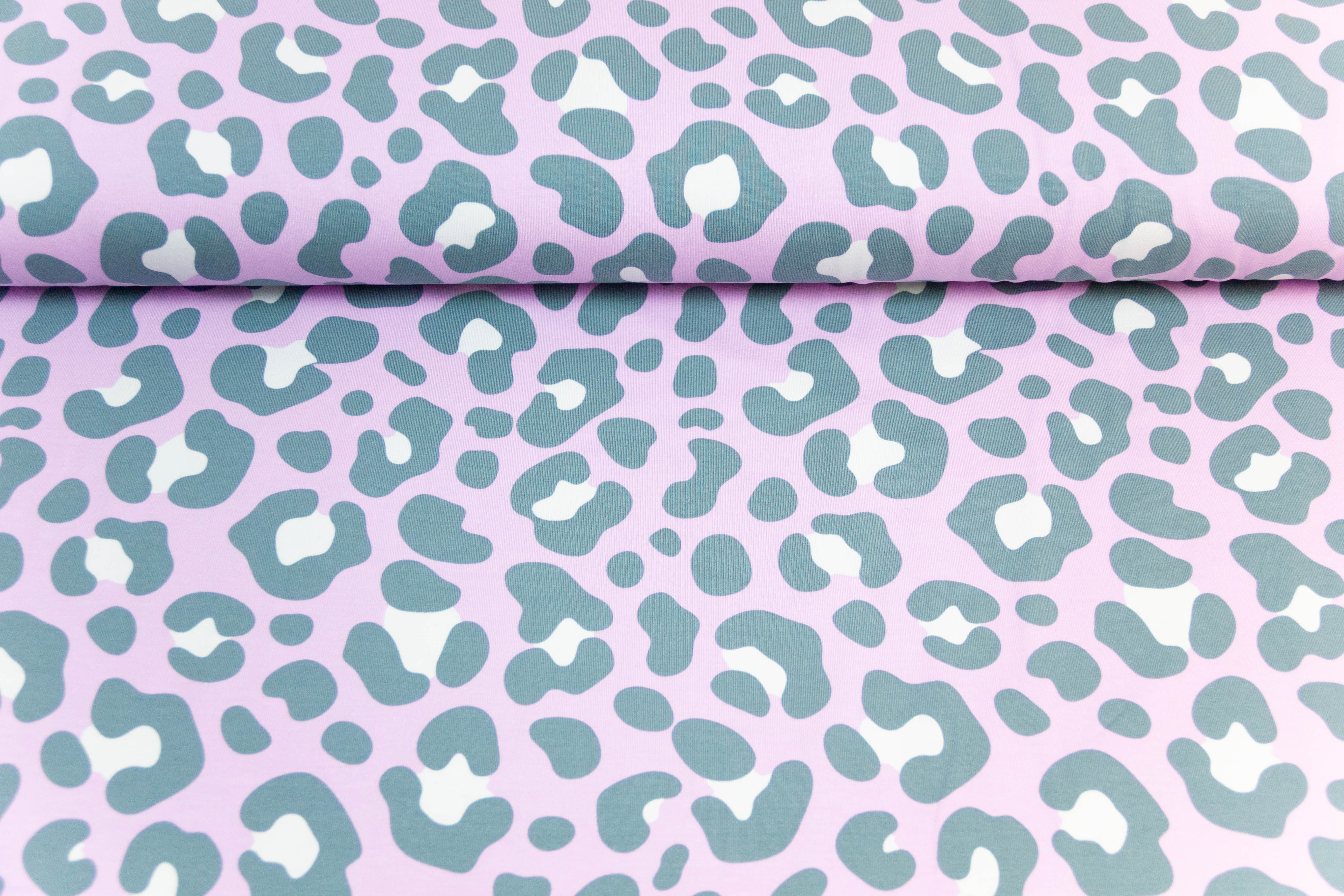 Baumwolljersey mit Leoprint auf fliederbarbenem Hintergrund.