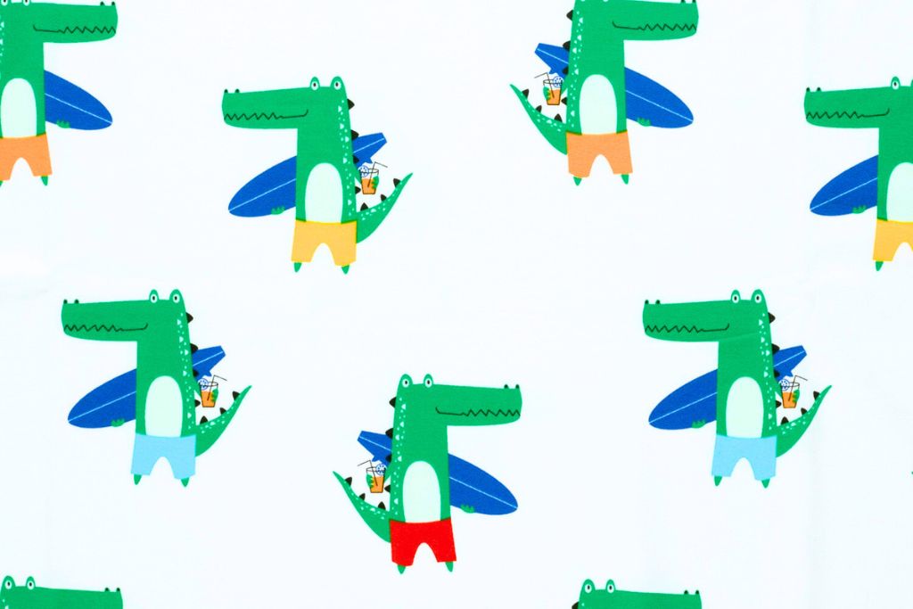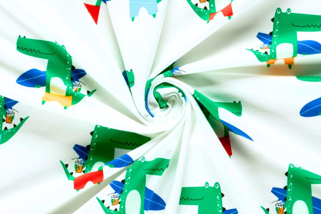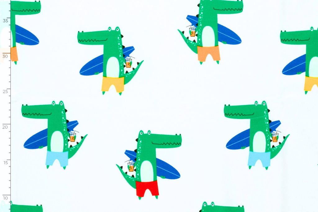 Sommerlicher Baumwolljersey mit witzigen Krokodilien mit Surfbrettern auf weißem Hintergrund.