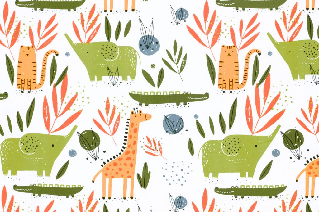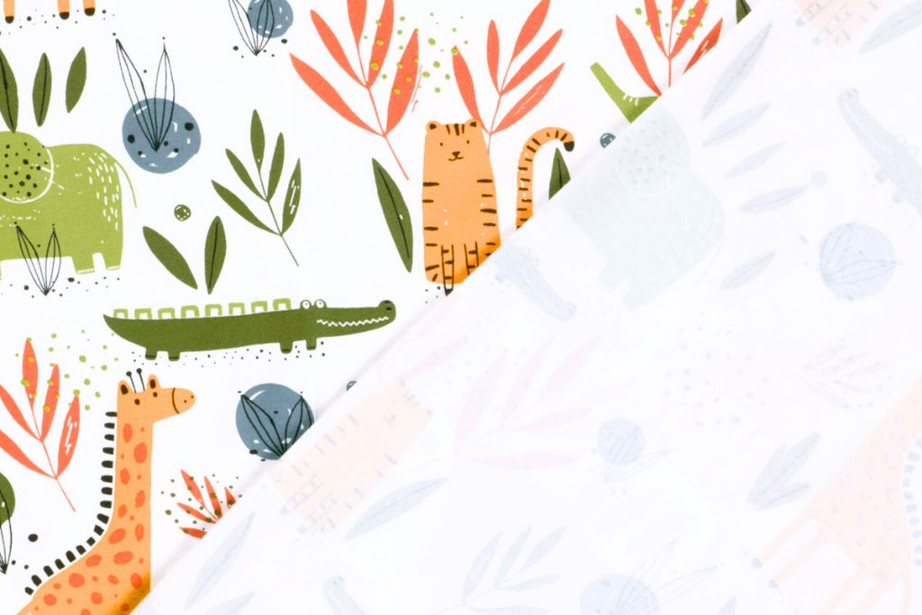 Süßer Baumwolljersey mit Elefanten, Krokodilen und Tigern auf wollweißem Hintergrund.