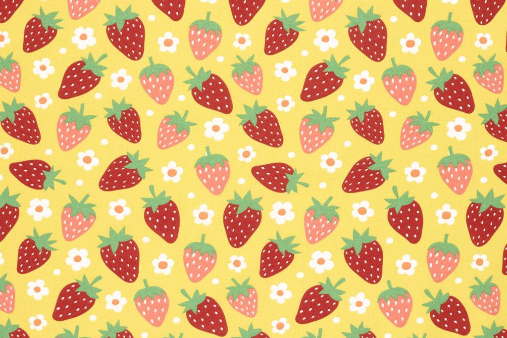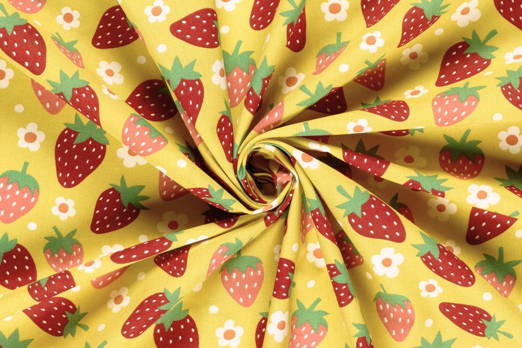 Baumwollwebware, Popeline mit Erdbeeren, ockergelb, 0,5 m
