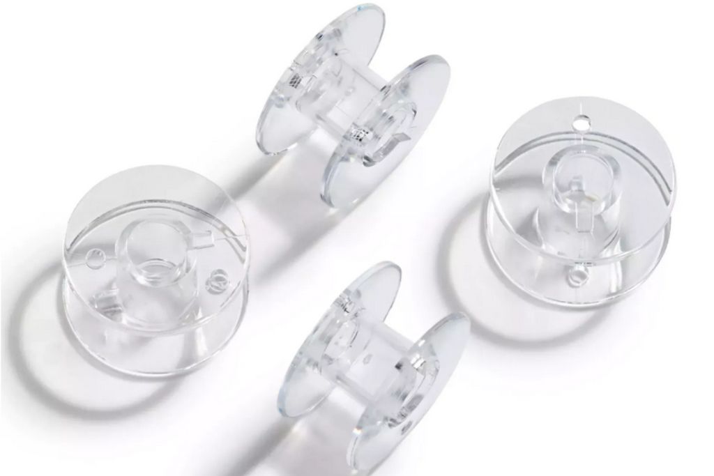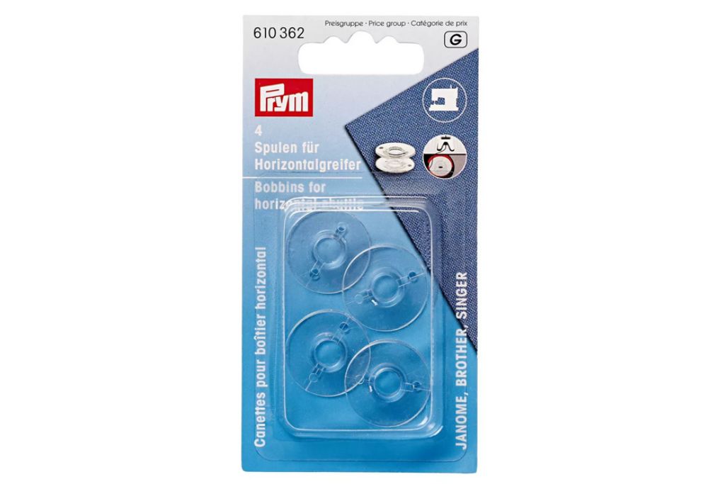 Der Horizontalgreifer ist ein System, welches ohne Spulenkapsel und mit einer geringen Fadenspannung auskommt. Für Maschinen mit diesem Spulentyp hält das Sortiment von Prym Packungen mit je vier gleichen Nähmaschinenspulen aus transparentem Kunststoff in drei verschiedenen Größen bereit. Ein großer Vorteil der Kunststoffspule ist, dass man stets die Farbe des Garnes und den Garnvorrat auf der Spule im Blick hat und so dem plötzlichen Ausbleiben des Unterfadens vorbeugen kann. Diese Nähmaschinenspulen sind für Nähmaschinen der Marken Janome, Brother und Singer geeignet.