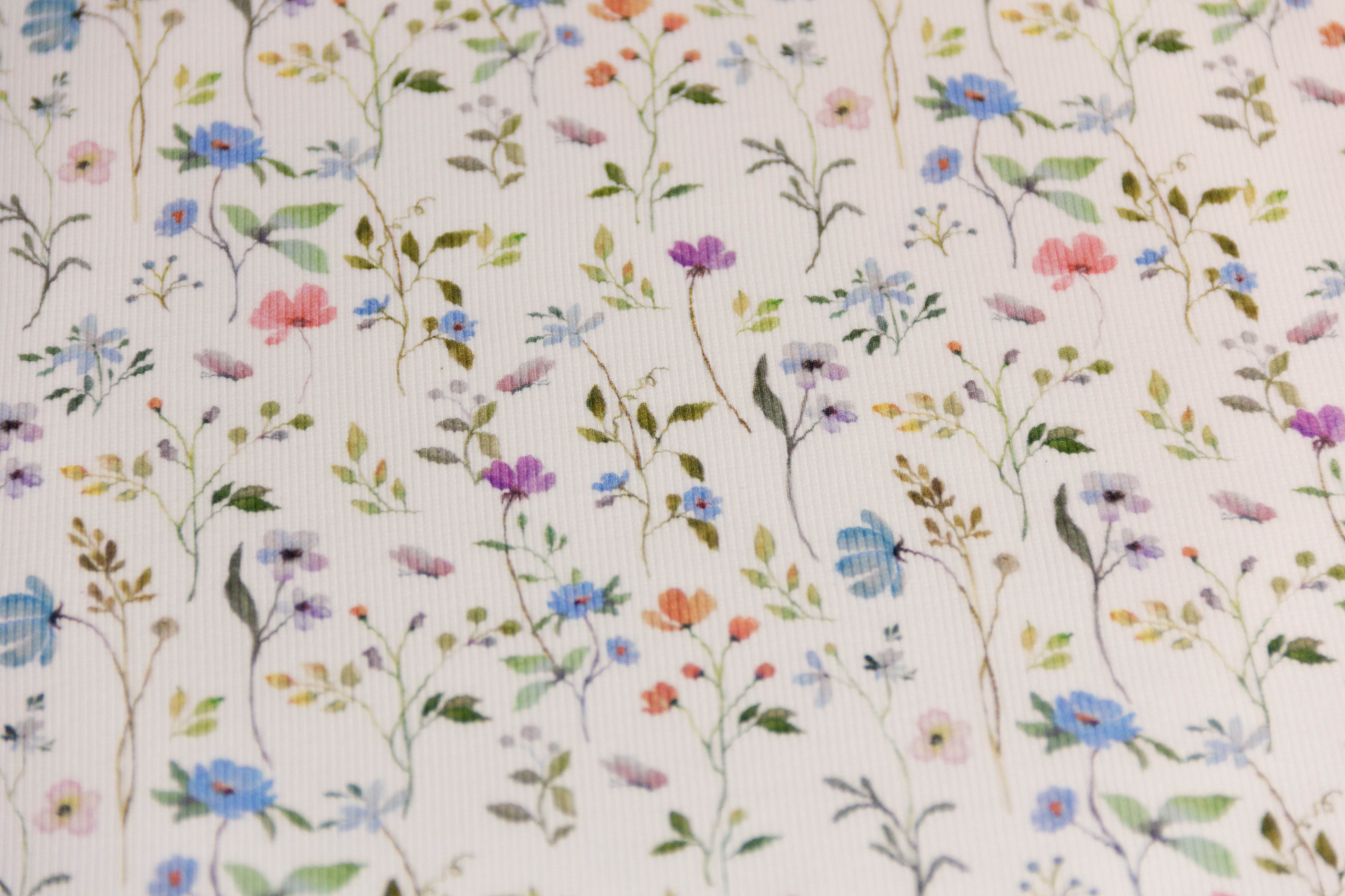 Wunderschöner weicher und elastischer Rippenjersey mit Blumen in zarten Farben auf wollweiß.