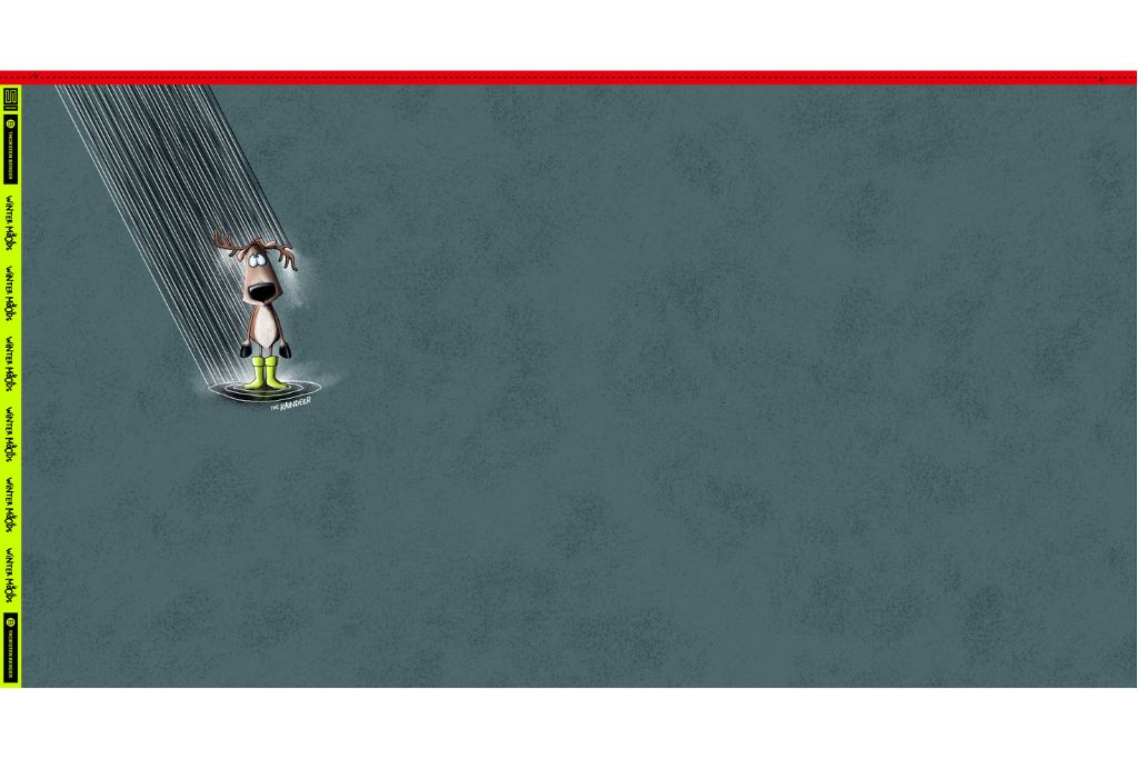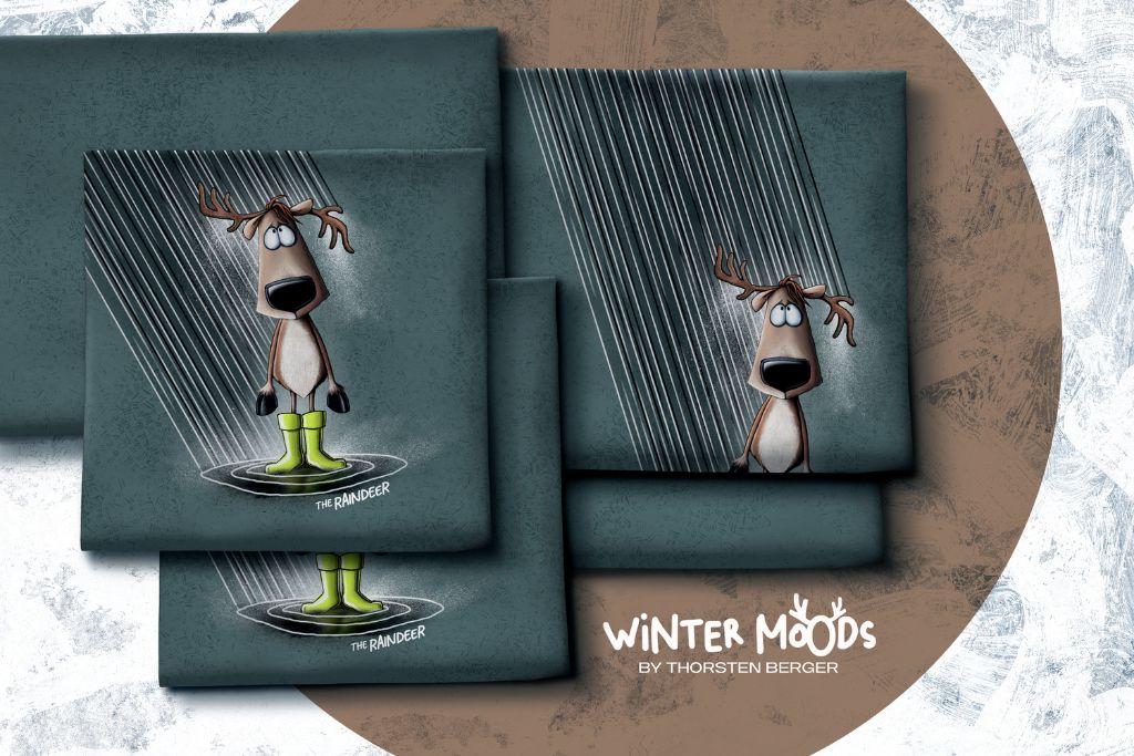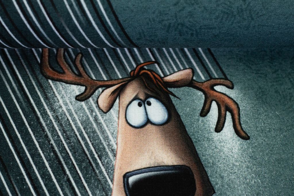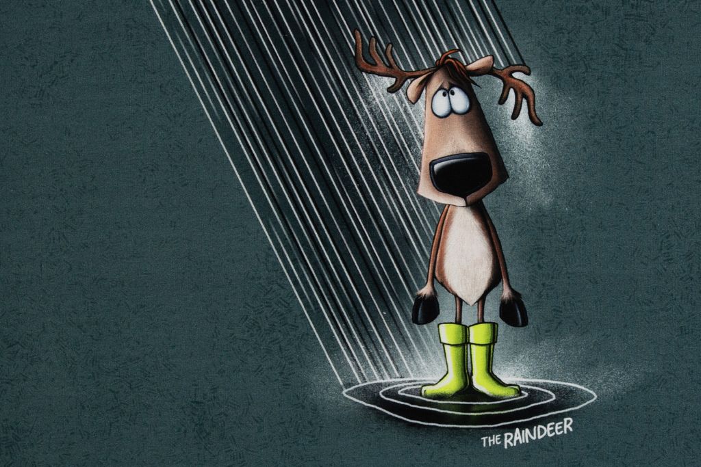 Rentier Rudolpho steht im Regen – mit leuchtend gelben Gummistiefeln und unerschütterlicher Gelassenheit. Das Motiv auf olivfarbenem Hintergrund ist humorvoll, außergewöhnlich und trotzdem vielseitig vernähbar.