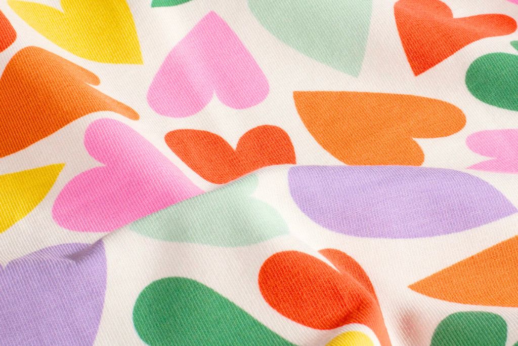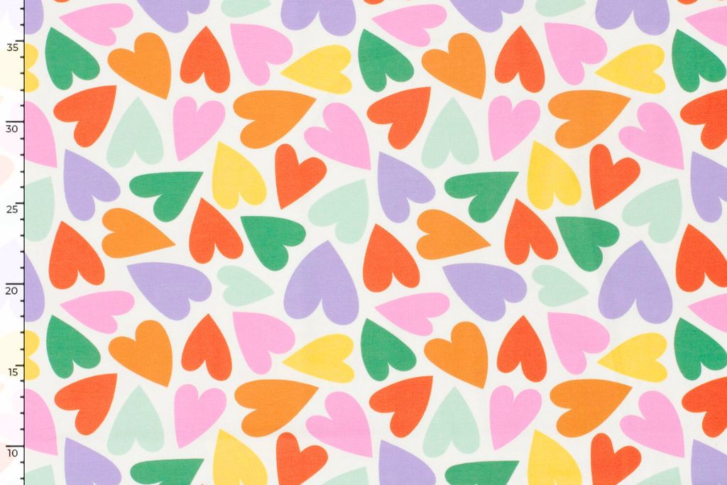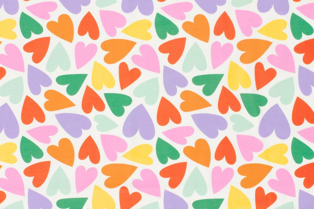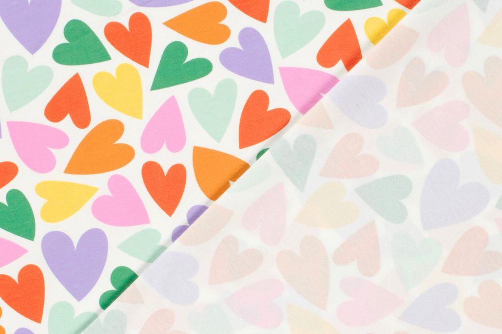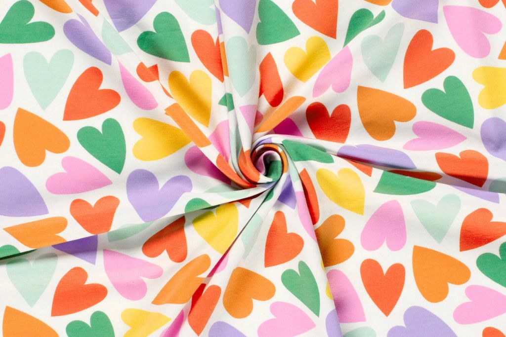 Hübsches Nähpaket aus Jersey mit bunten Herzen auf wollweißem Hintergrund.