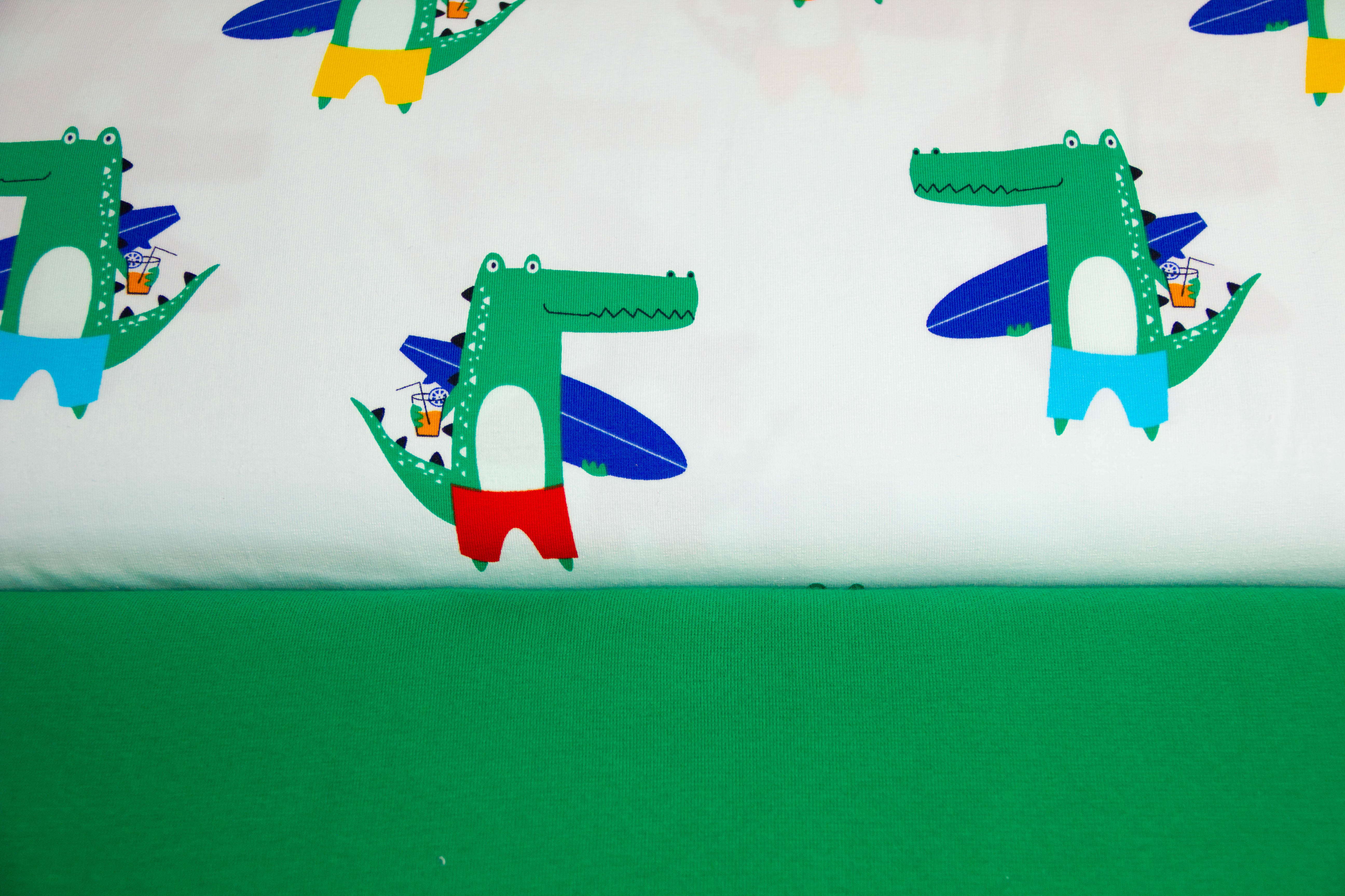 Cooles Nähpaket aus Jersey mit Krokodilen auf weißem Hintergrund.