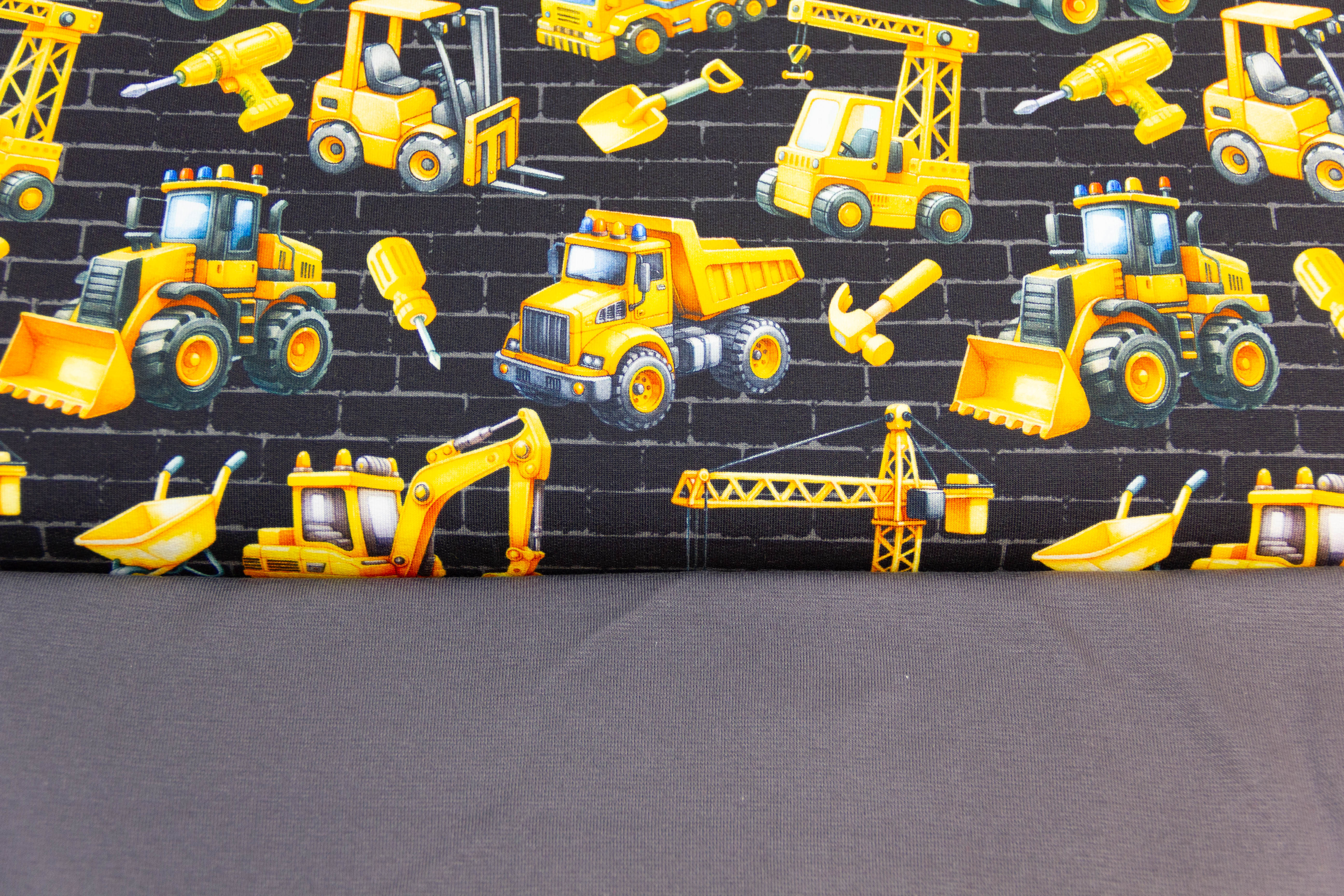 Weiches Nähpaket mit French Terry mit Baggern und Kränen auf schwarzem Hintergrund.