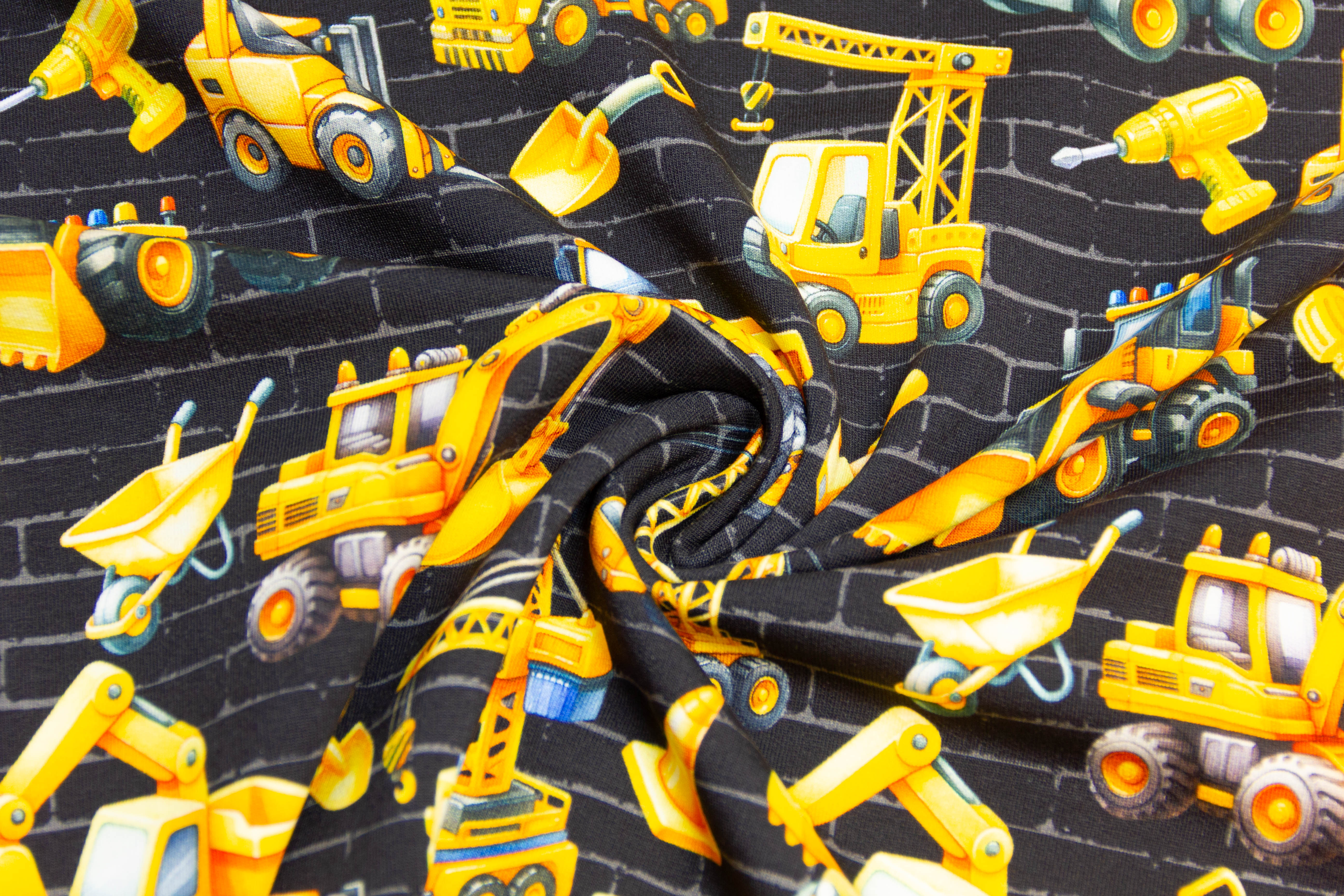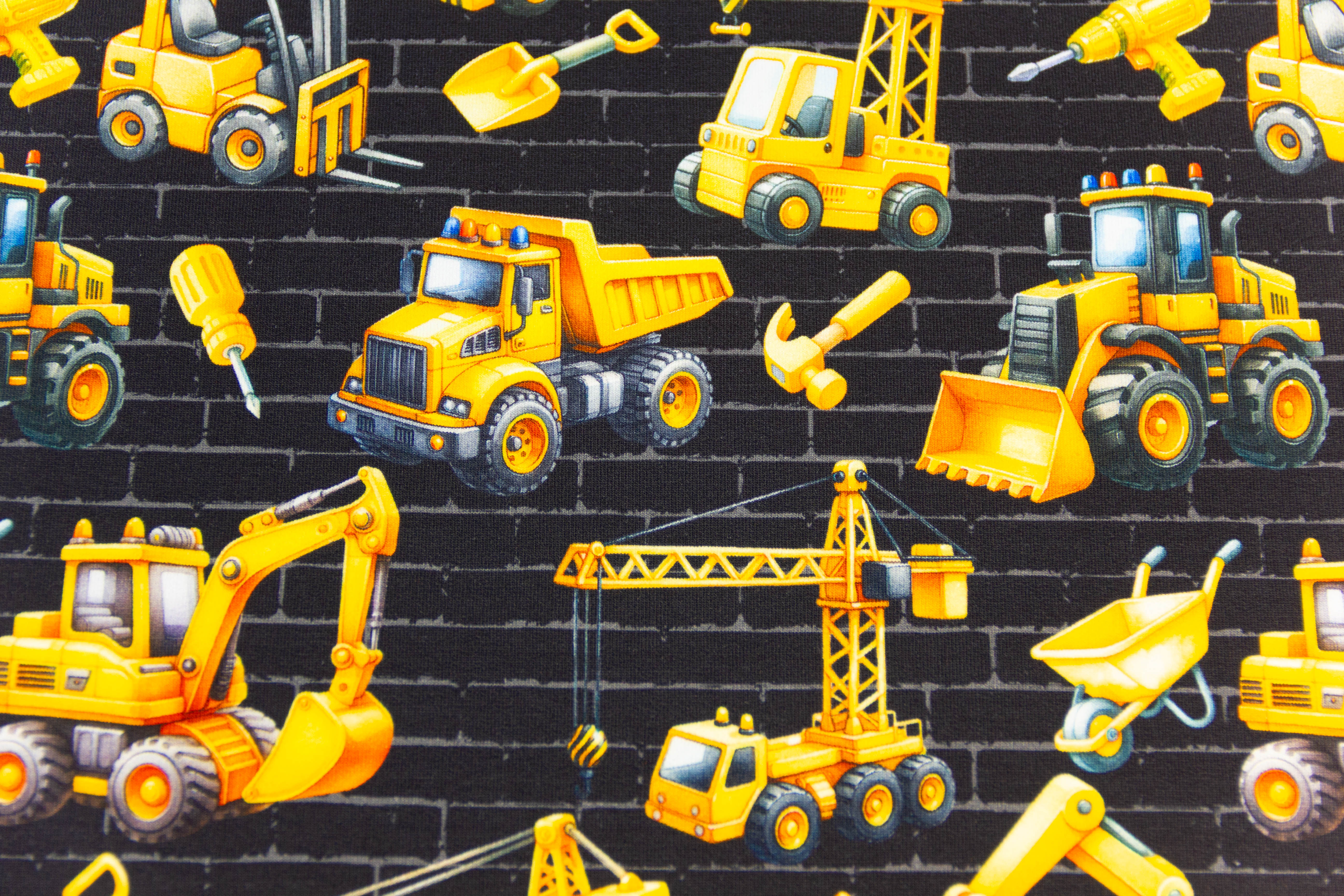 Weiches Nähpaket mit French Terry mit Baggern und Kränen auf schwarzem Hintergrund.