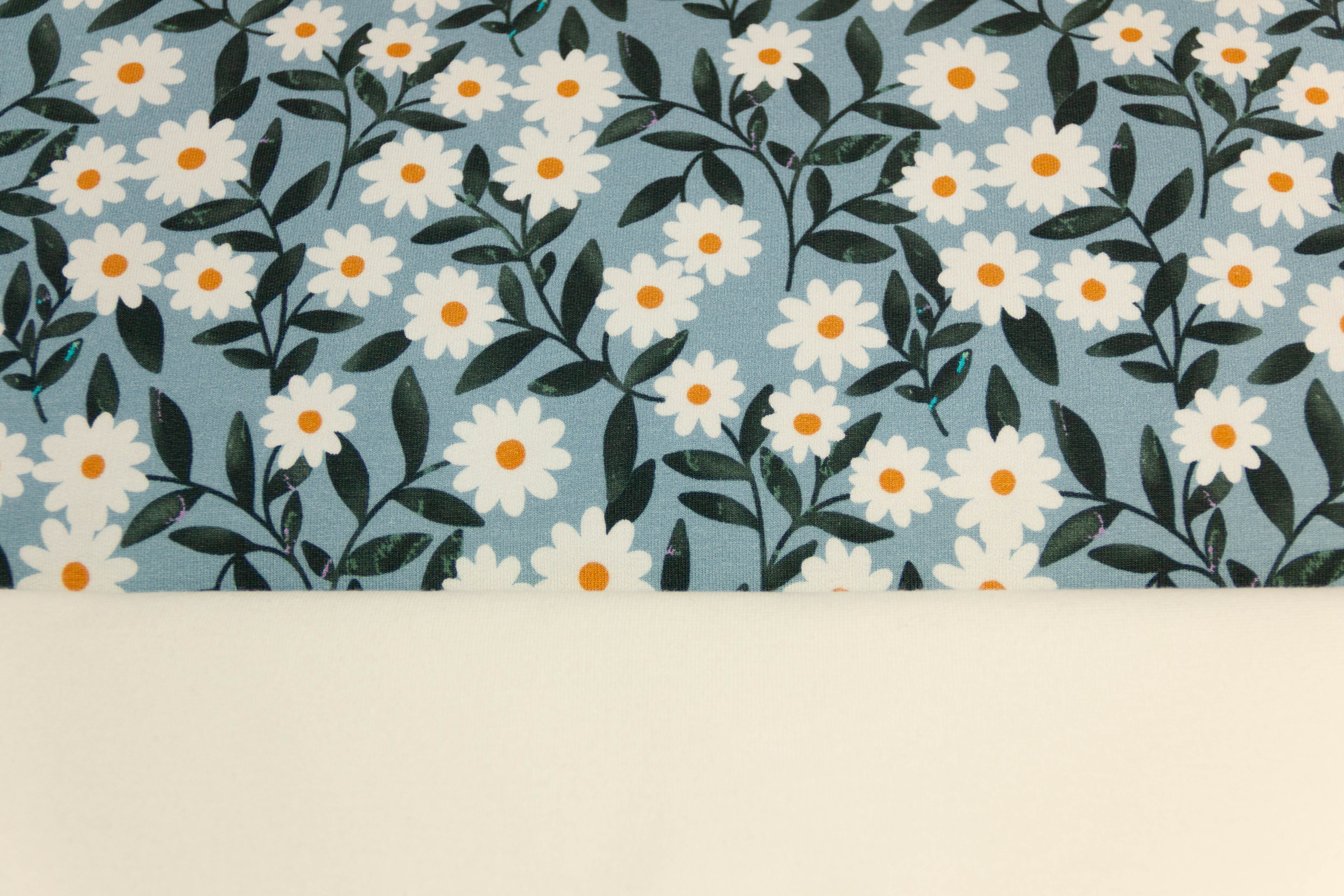 Weiches Nähpaket mit French Terry mit Gänseblümchen auf blauem Hintergrund.