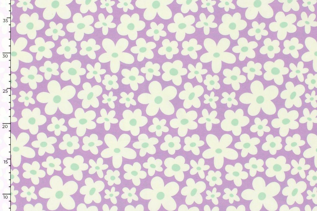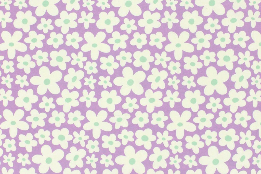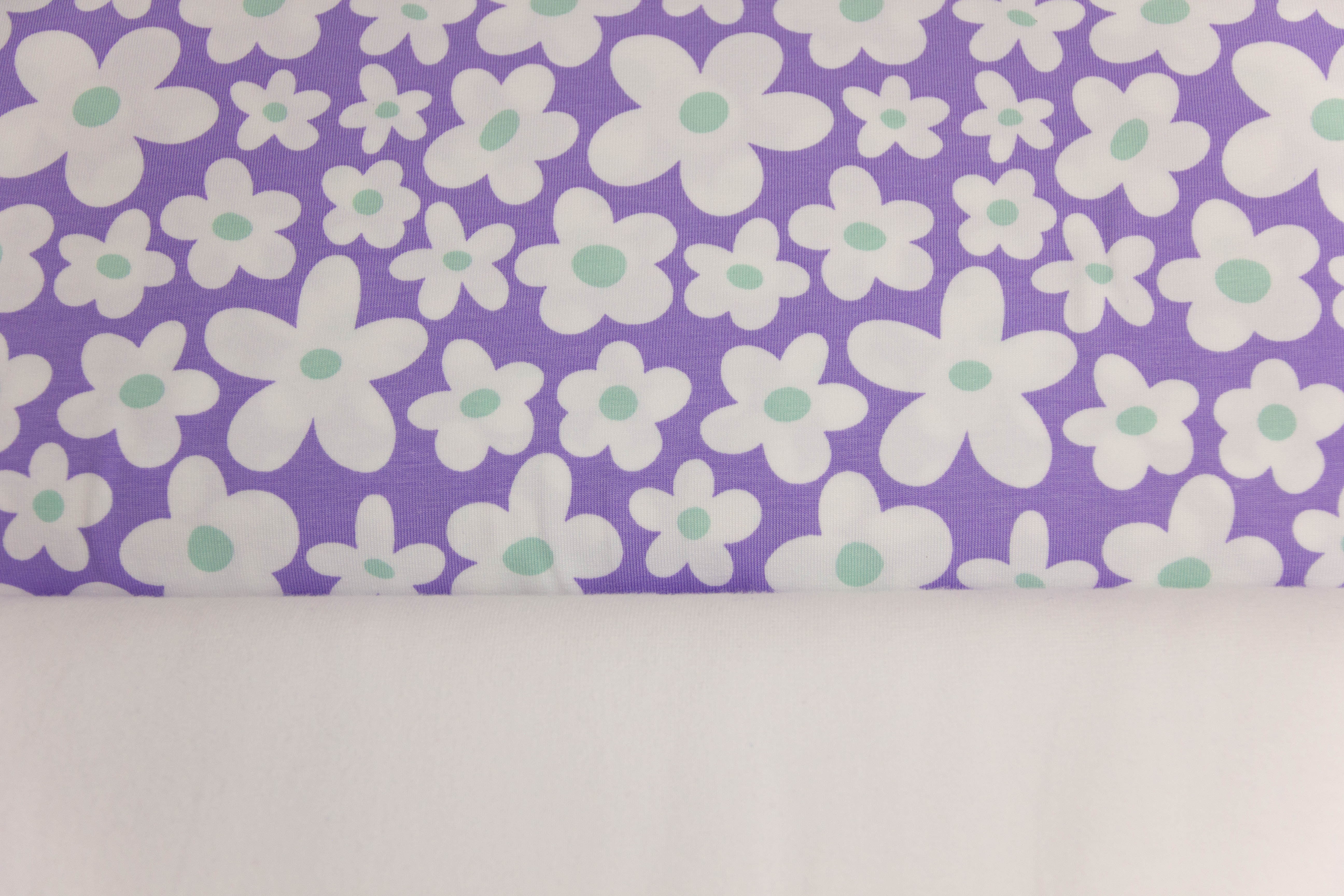 Elastisches Nähpaket aus Jersey mit weißen Blumen auf lavendelfarbigem Hintergrund.