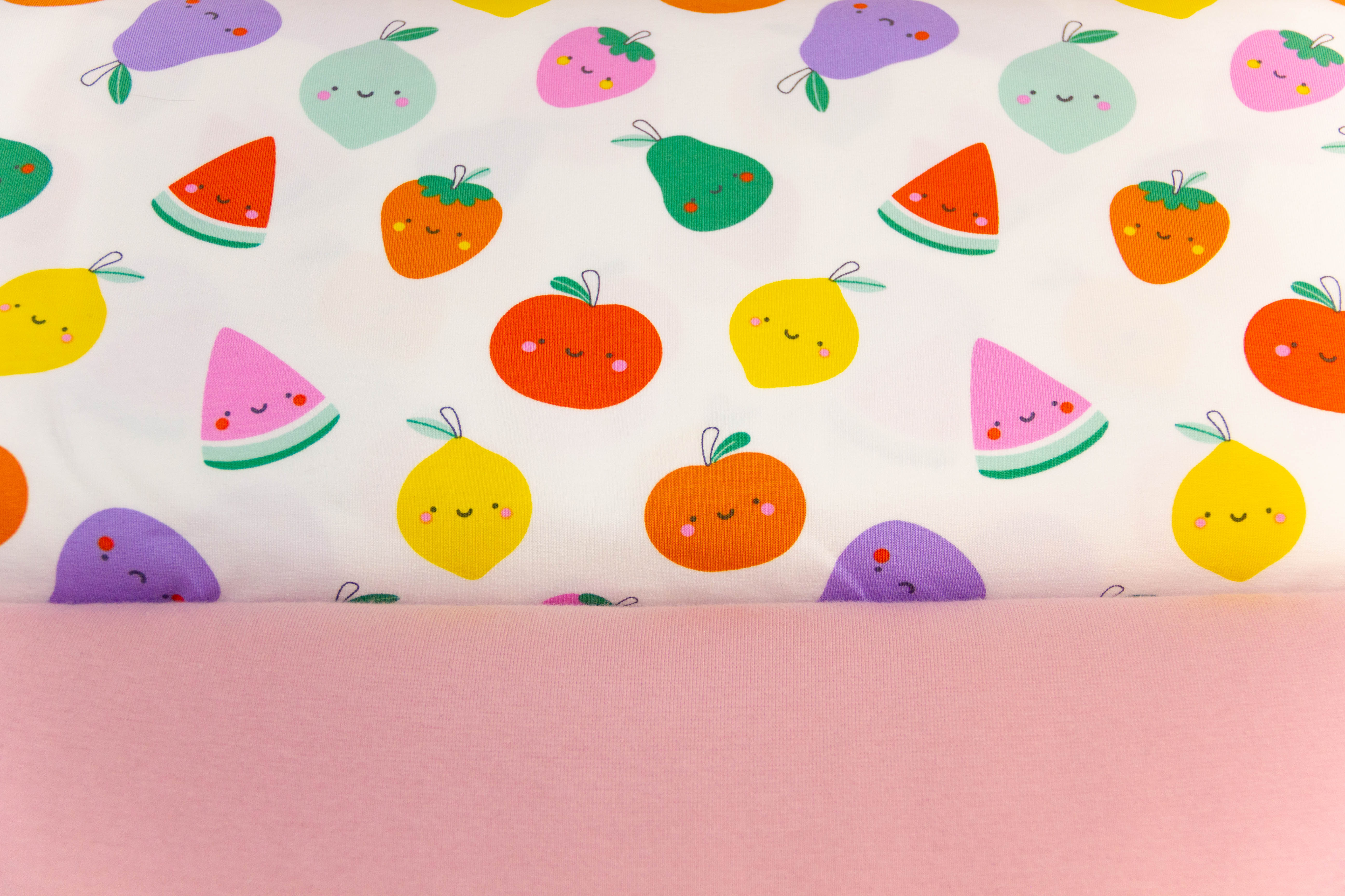 Stoffpaket Jersey + Bündchen Jersey mit Früchten, Obst, wollweiß, rosa