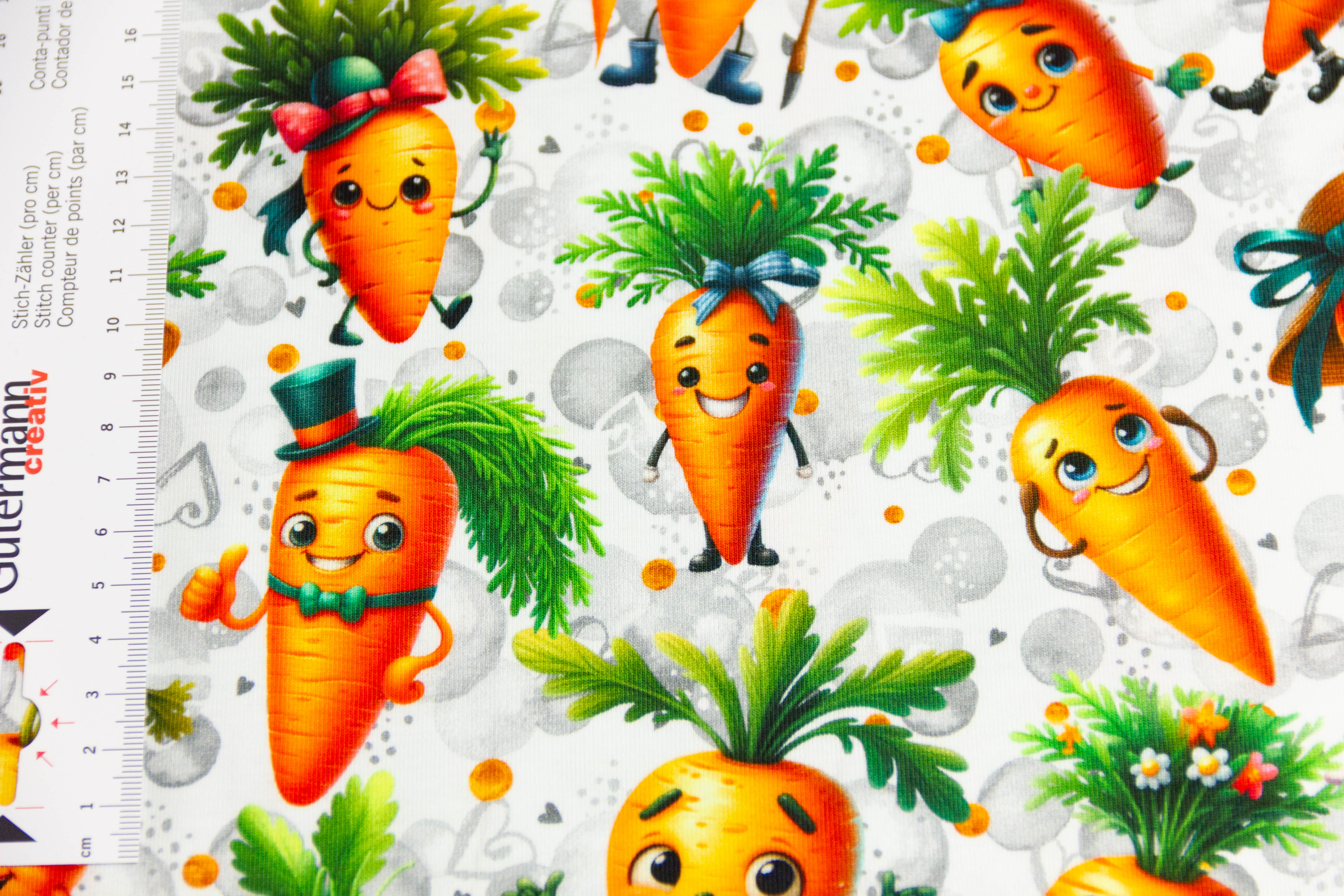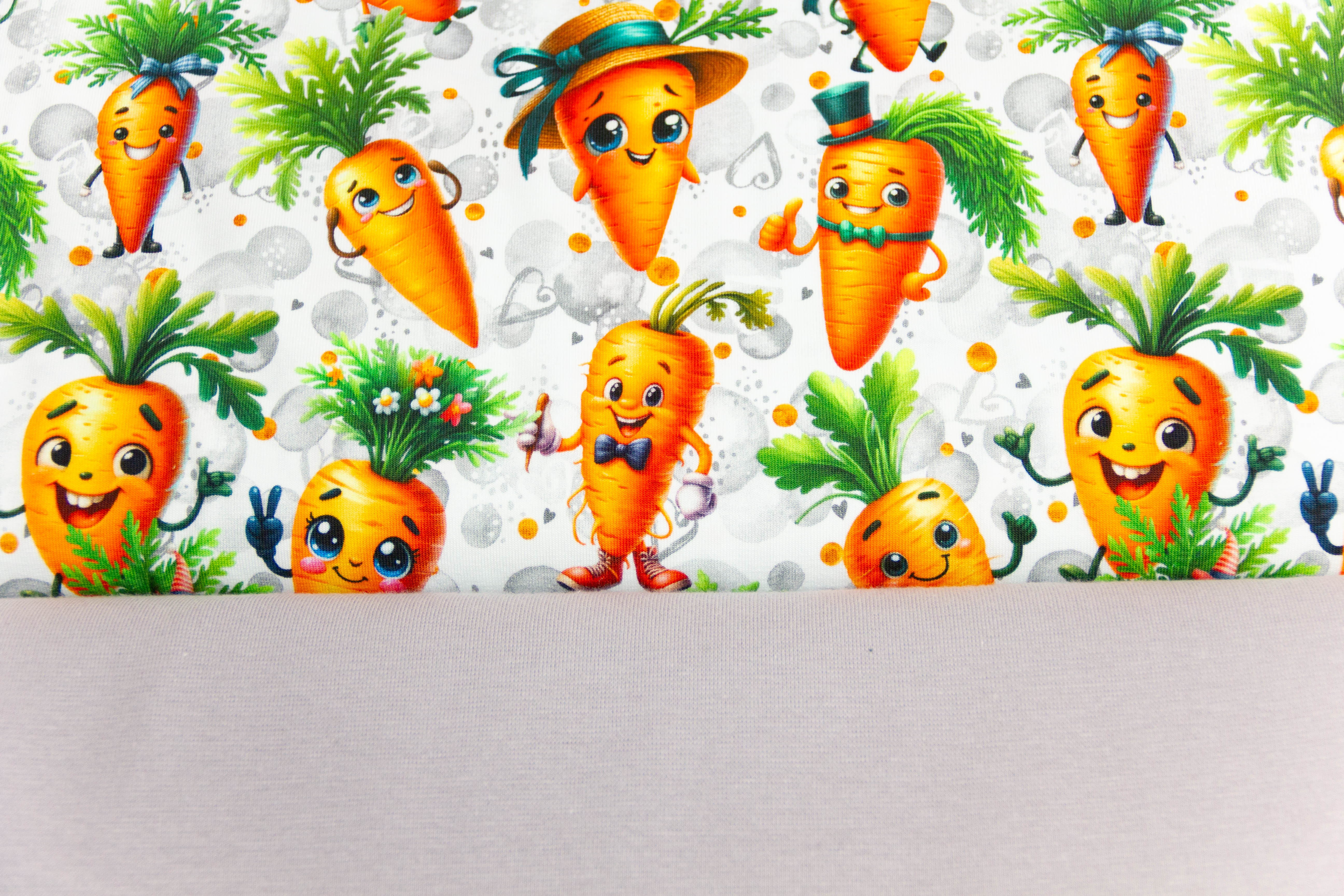 Elastisches Nähpaket aus Jersey mit lustigen Karotten auf weißem Hintergrund.