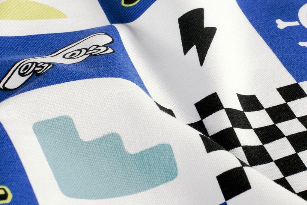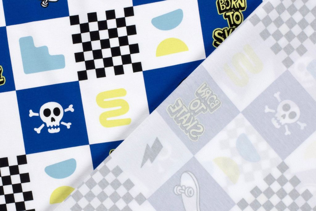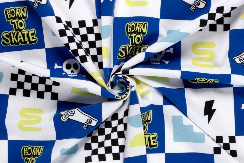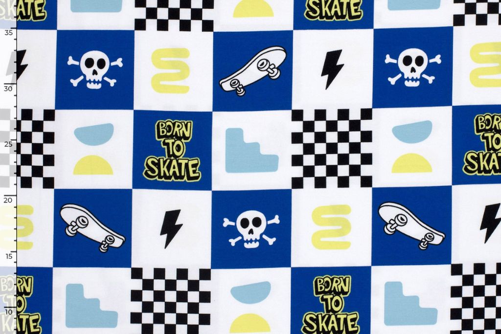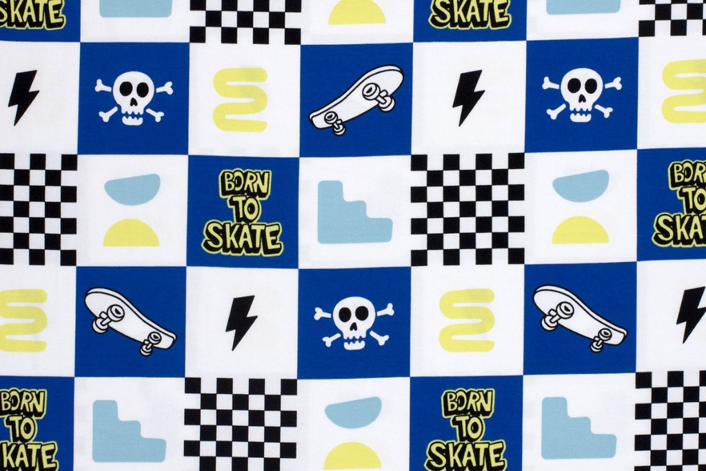 Cooles Nähpaket aus Jersey mit Skateboards und Totenköpfen auf blau-weißem Hintergrund.