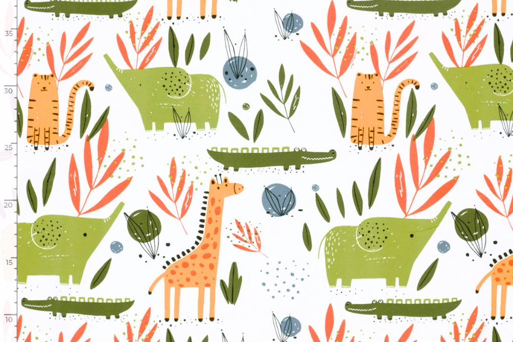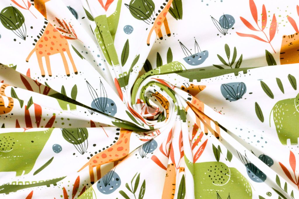 Nähpaket aus Jersey mit Zootieren auf wollweißem Hintergrund.