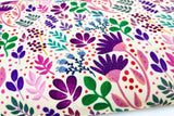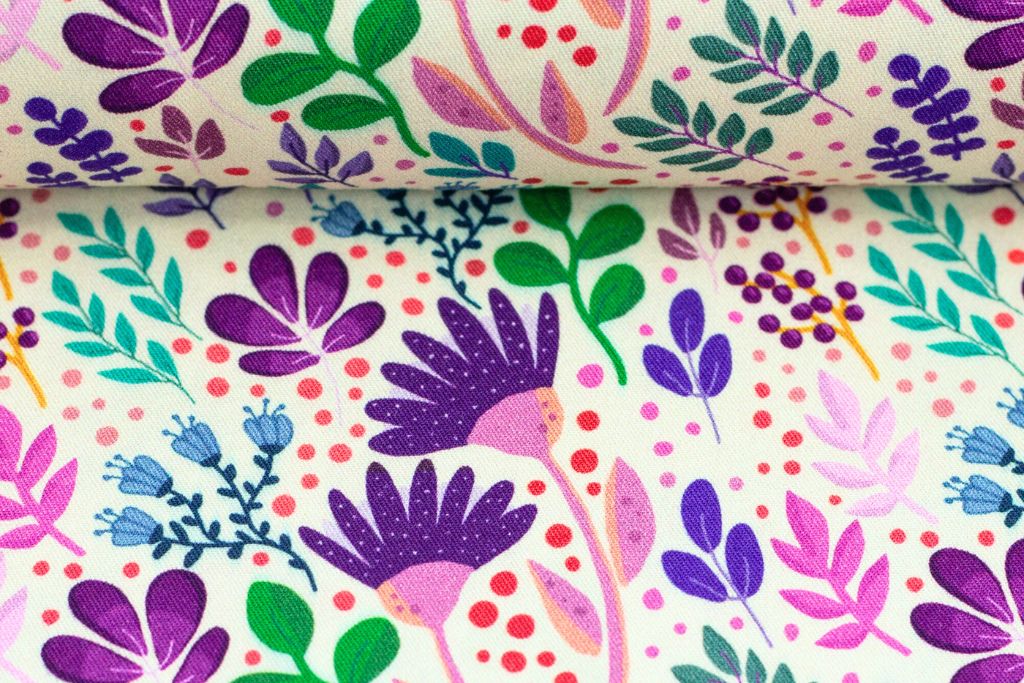Luftig leichte Viskose Webware mit floralem Muster auf naturweißem Hintergrund.